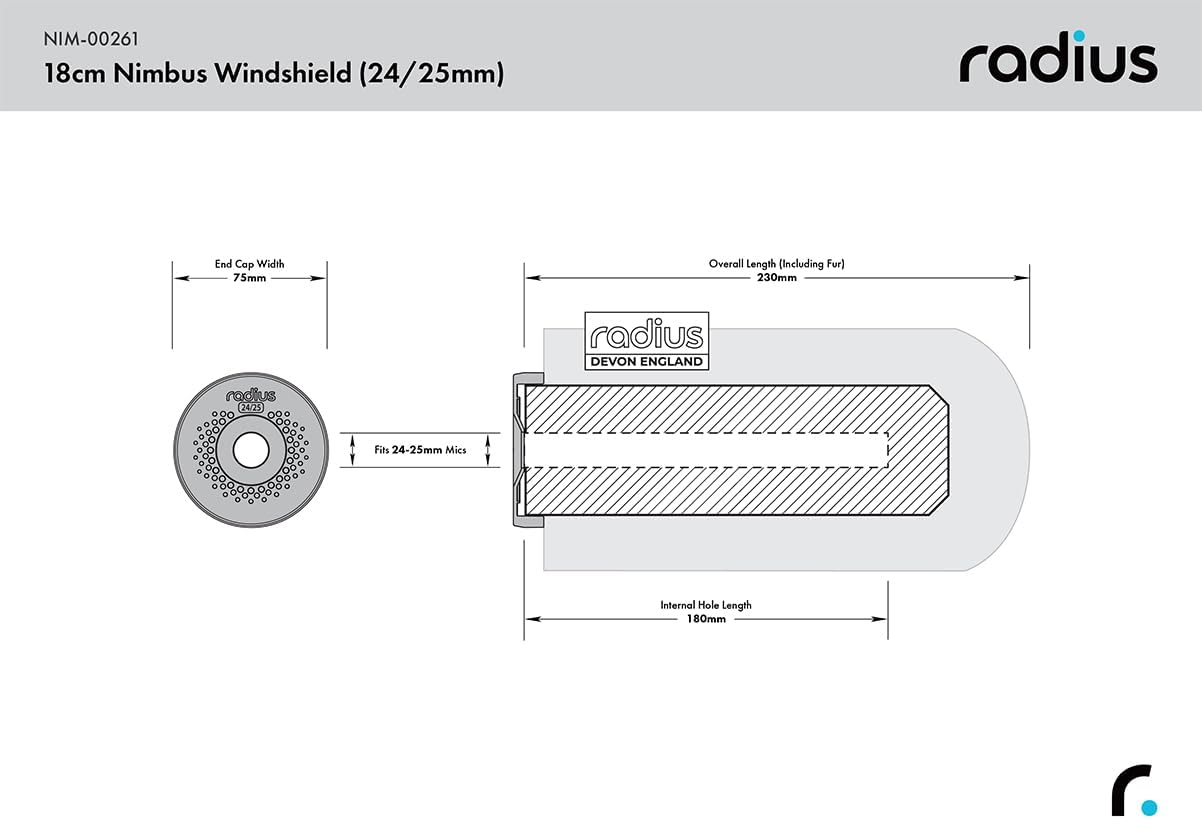 The Nimbus Windshield by Radius is a slide-on windscreen made to fit shotgun, small condenser and broadcast camera-mounted microphones. It is designed to reduce up to 25dB of wind noise generated from light to moderate winds, whilst maintaining high frequency audio clarity. The specially designed rubber end cap is made to fit snugly around 24/25mm microphones, preventing wind from entering behind the capsule. The Nimbus windshields are also the only slip-on fur windscreens to incorporate small "pepper pot" hole openings on the end caps to reduce air pressure near the capsule. This unique feature diminishes the “muddy or muffled” sound that can occur at some frequencies and adds extra clarity when recording with certain microphones. Each Nimbus is made using acoustic synthetic fur and a porous open cell foam internal core.