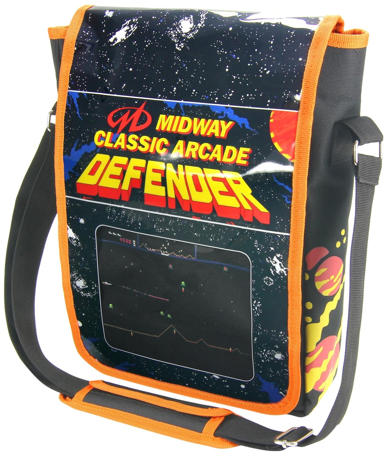 The gauntlet arcade messenger bag mimics retro game kiosks, including coin slots and cabinet art. It is made of durable polyester and has a unique screenshot top flap. Featuring a spacious main compartments with interior organization pockets and a zipper